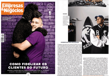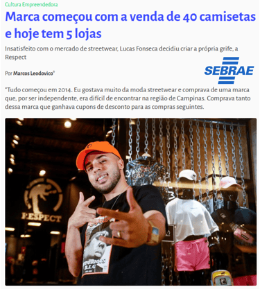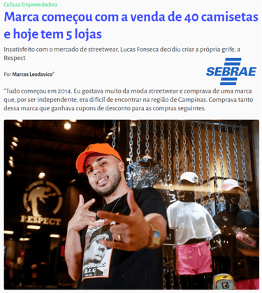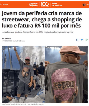E também é fundador e Diretor Criativo da Respect Brand, marca de streetwear nacional que vem se consolidando como referência no segmento. Hoje, a Respect conta com mais de 50 pontos de venda pelo Brasil e uma loja física em um dos maiores shoppings de luxo do país, provando que é possível transformar identidade em negócio sólido e escalável.